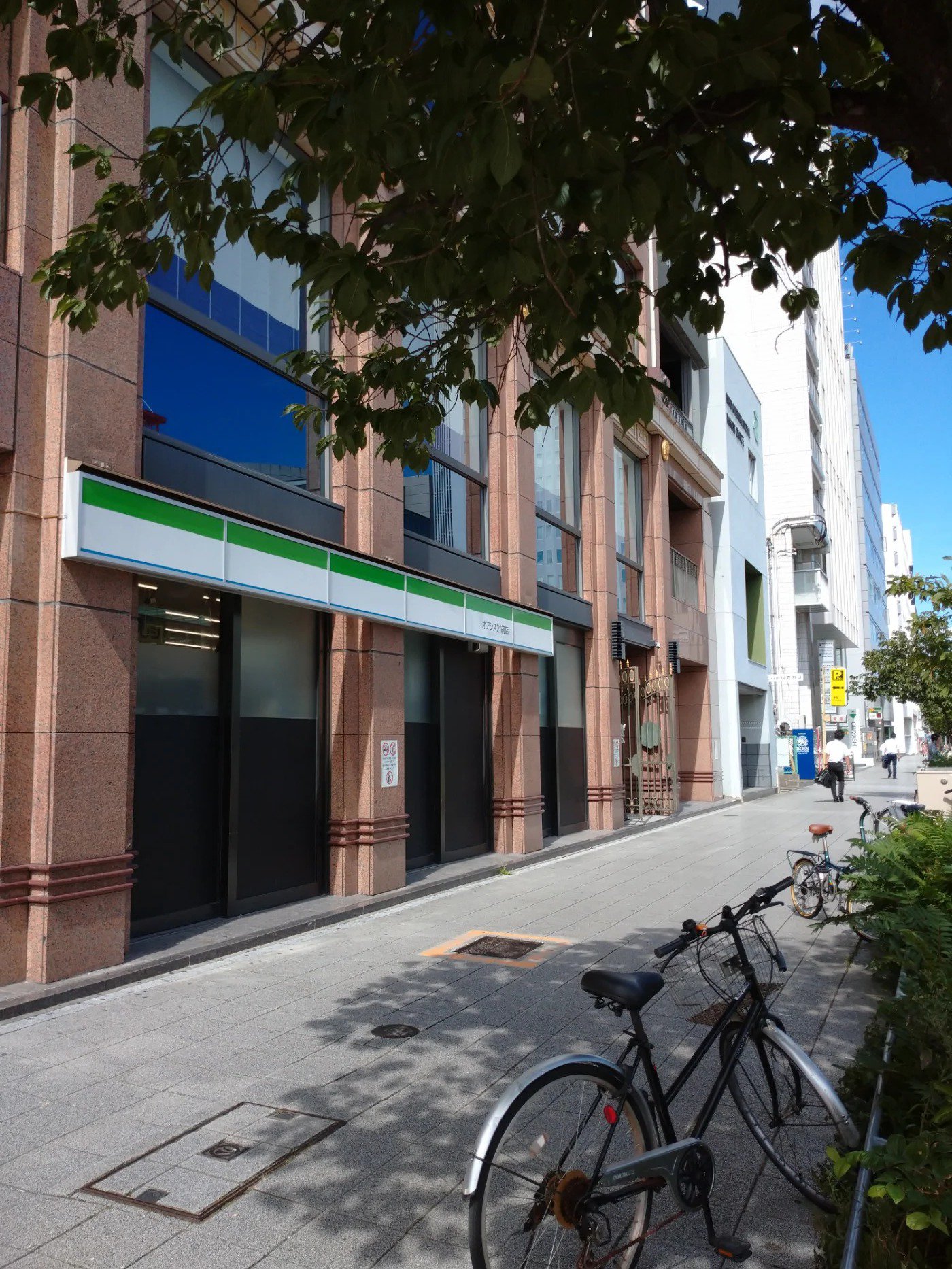 緑・青マークの大林組(OBAYASHI)の看板がある有料駐車場の、向かって右隣にあるグレーのビルです。